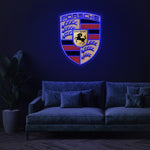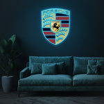 Ce néon Porsche est fabriqué avec des matériaux de qualité pour un rendu éclatant, durable et sans entretien. L'effet lumineux blanc met en valeur chaque détail du blason : les couleurs rouge et or, le cheval noir, la ville de Stuttgart, et bien sûr le lettrage Porsche en haut du blason.